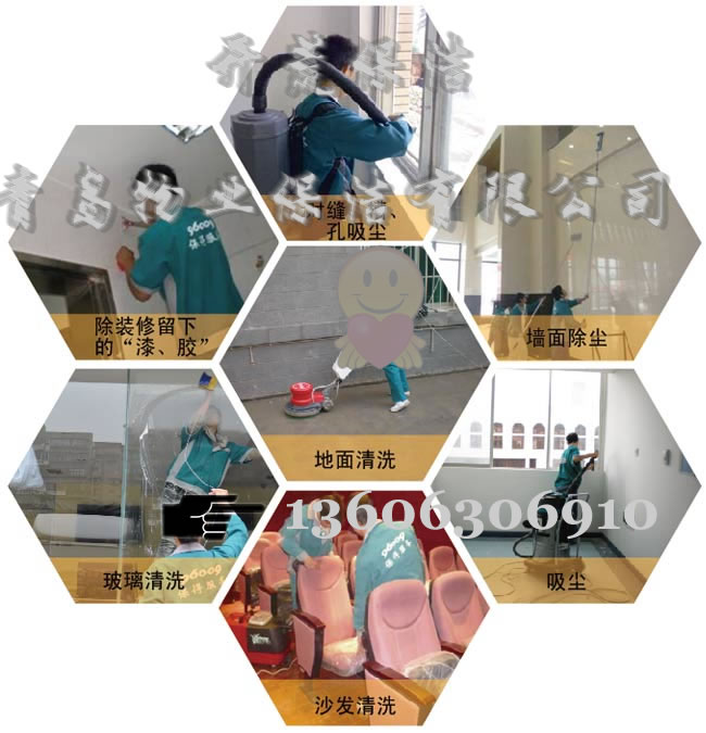 青岛物业保洁有限公司主要服务有:工程开荒、玻璃幕清洗保洁、高空外墙粉刷清洗、各类高空做业、大理石结晶翻新、大理石清洗养护、物业管理、家政保洁、地毯清洗、地板打蜡、地暖清洗、油烟机清洗、管道疏通、布艺沙发清洗、园林绿化维护、广告牌清洗、门头清洗、灯箱清洗、学校物业保洁管理、商场物业保洁管理、医院物业保洁管理及保洁用品配送;批发销售:大功率吸尘器、洗地机、洗涤用品;酒店用品等!
